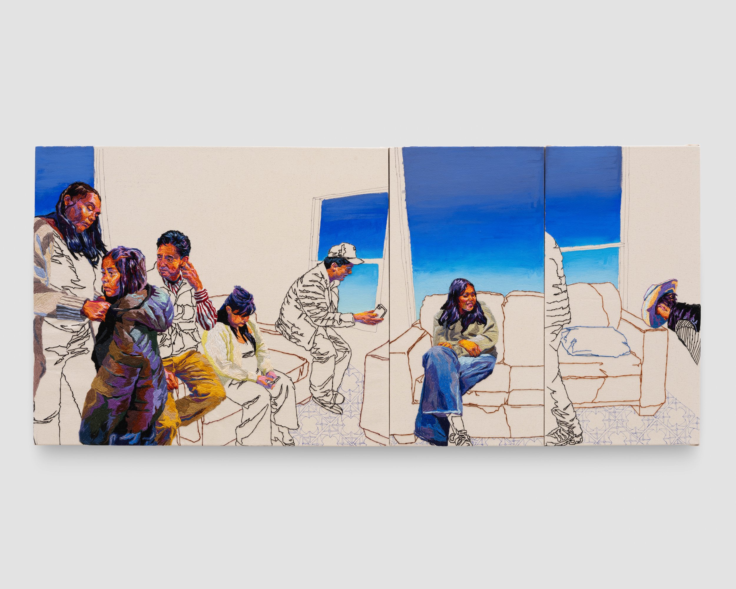 The largest work in the exhibition captures the comfort and ease of a domestic scene. Over three panels, La sala’s disjointed visual narrative conveys a sense of time and movement within the space as figures relax in each other's presence. Here and elsewhere, the space around the figures has been distilled into its simplest detail, allowing the eye to focus on the vibrancy of the figures themselves and of the sky glimpsed through the windows. A sense of continuity flows through the scene, as if we are watching an entire afternoon pass by. Past and present exist together throughout this body of work. Beginnings and endings intermingle, yet all is suffused with a serenity born in community.