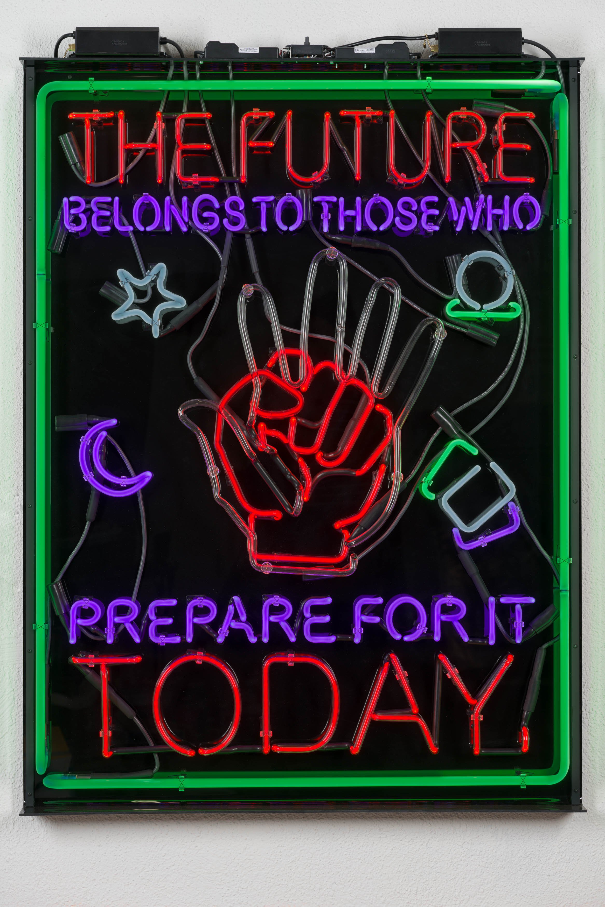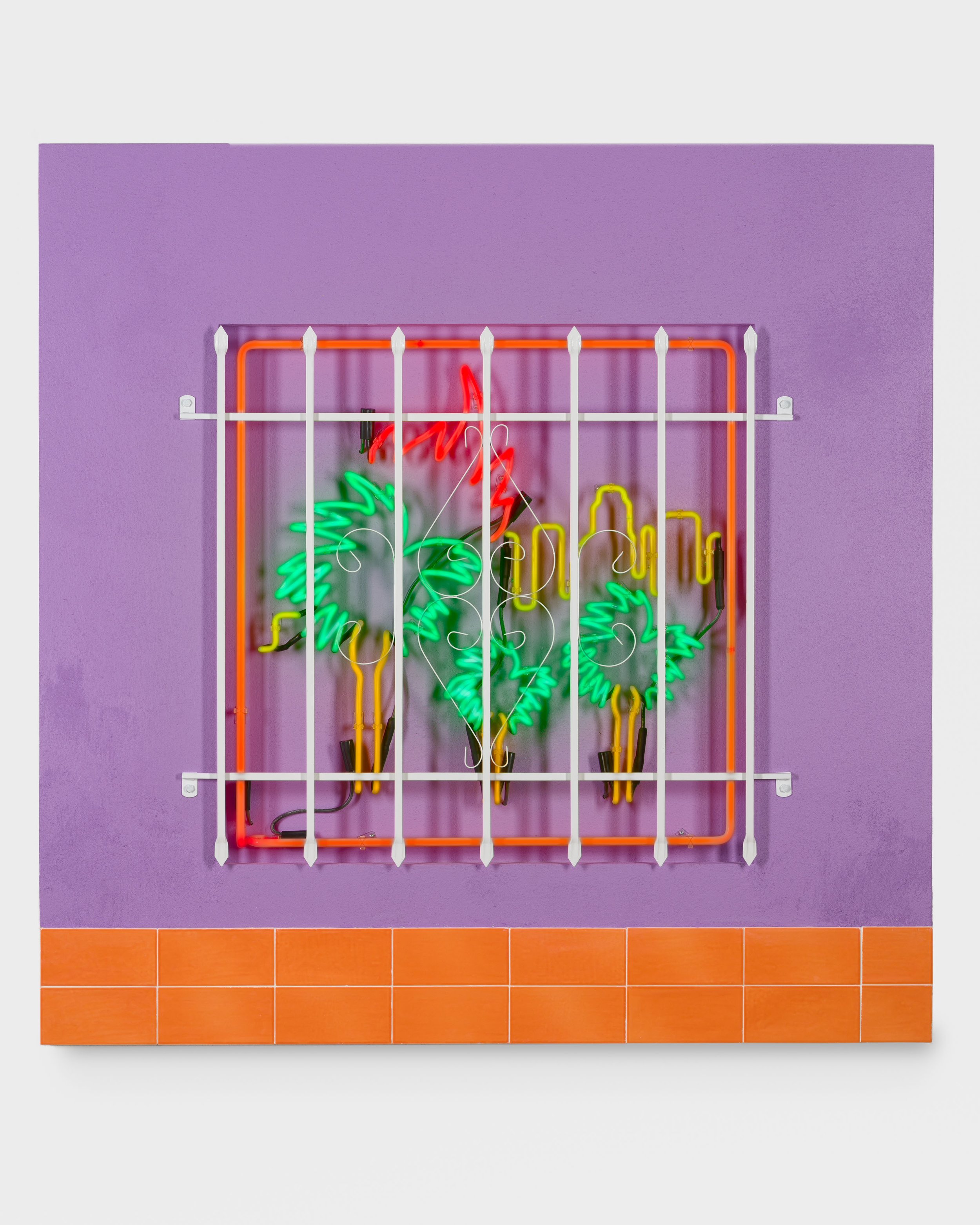 Patrick Martinez is at the vanguard of a movement of BIPOC artists making mixed media paintings in response to their lived environment(s) around East and South Central Los Angeles and San Gabriel Valley. Typical in Patrick’s neighborhood are corner stores adorned with murals of various kinds, many containing references to Nahua or Maya mythological forms. Also common are security bars and home-based businesses featuring neon signage addressing motorists and passerby from available windows. Operating in a manner similar to collage, Patrick’s landscape works locate viewers in a particular geographic place with a demonstrable ethnic identity and socio-economic position. These paintings are executed on wood panel and are painted and assembled in layers. There are several layers of clear figuration, each of which is painted over with house paint once complete. Patrick then uses a pressure washer to blast away the house paint, exposing the under-layers of figuration, resulting in the visual suggestion of aging, erosion, and the passage of time. The foundational layers of figuration will frequently display evidence of aerosol paint tags, with subsequent buffs of those tags which are later tagged again, imparting a sense of narrative to the places evoked in the paintings. Atop these multi-layered surfaces Patrick adds neon forms, signature ceramic elements, and found materials such as security bars and tarp signage to complete the compositions. The results are abstracted landscapes that evoke sites in Patrick’s community and their respective timelines - the viewer sees the decades of wear in each surface and feels the vulnerability of each place to change and possible displacement.