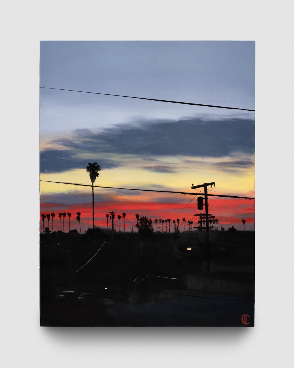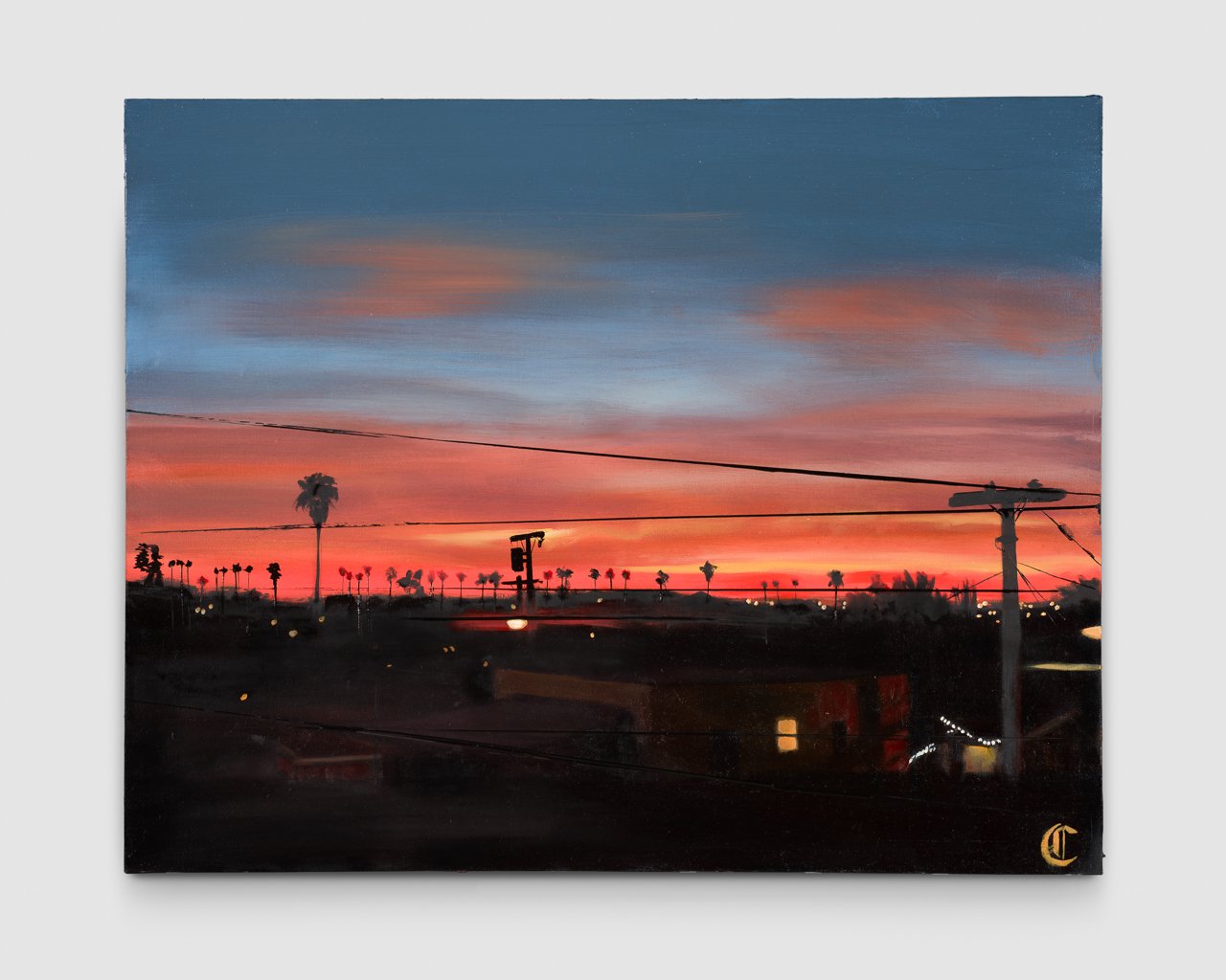 Cansino archives the tattooed line in Reinas, a drawing in ballpoint pen on lined paper executed using a tattoo machine. The paper will weather much like skin, creating a parallel timeline that speaks to the essential ephemerality of the medium. Elsewhere, radiant painted landscapes depict the vast Los Angeles skies criss-crossed with the power lines and barbed wire that are ubiquitous in the neighborhoods south and east of downtown Los Angeles. Throughout the works on view, Cansino continually draws the viewer’s attention to her own history and community, anchoring the work in the Chicano experience and centering stories and bodies overlooked in the art historical canon.