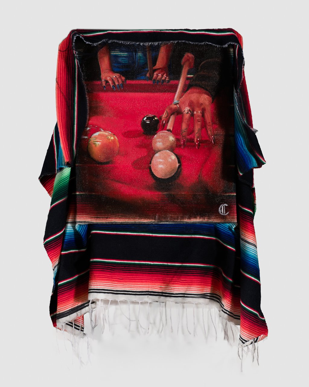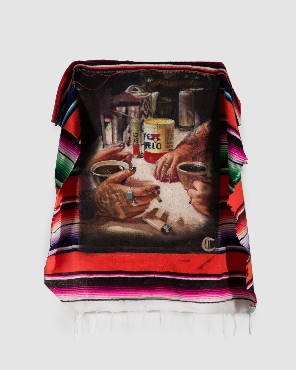 The Independent presentation will also include two serape paintings, in which Cansino works directly on traditional Mexican textiles. These works tightly focus on Chicana hands in familiar daily settings that suggest an intimacy borne of shared experience: drinking coffee, smoking, playing pool. They are individuated by their elaborate rings, tattoos, and long painted nails. These works continue Cansino’s project of centering Chicano bodies within her work, and especially those of her own community. The serapes are stretched on frames with the excess fabric left to hang from all sides, emphatically asserting their own objecthood.