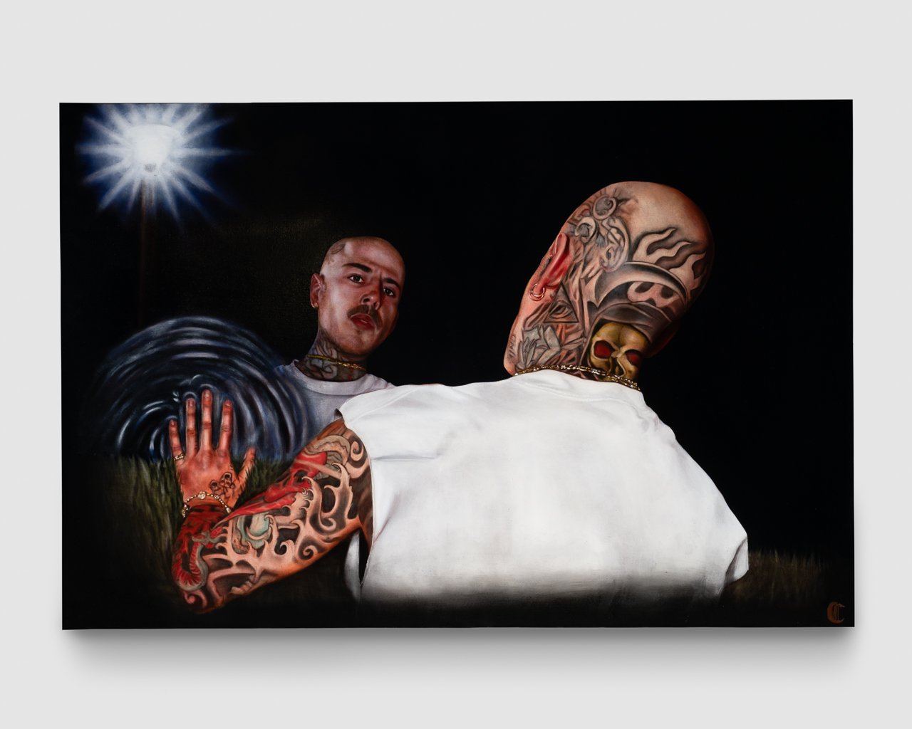 Charlie James Gallery is proud to present new works by Danie Cansino at the 2024 Independent Art Fair, the artist’s first solo presentation in New York. A Los Angeles-based artist and educator with roots in tattooing, Cansino employs Baroque grisaille techniques in paintings that cast BIPOC and especially Chicano bodies in large, allegorical compositions that propose new subjects for the art historical canon. Drawing inspiration from Old Master paintings in both subject and execution, Cansino emphatically centers Brown, tattooed bodies in grand compositions that elevate her own Los Angeles community. In addition to these large paintings, the Independent presentation will include landscapes, paintings on Mexican serapes, and a tattoo-inflected drawing in ballpoint pen.