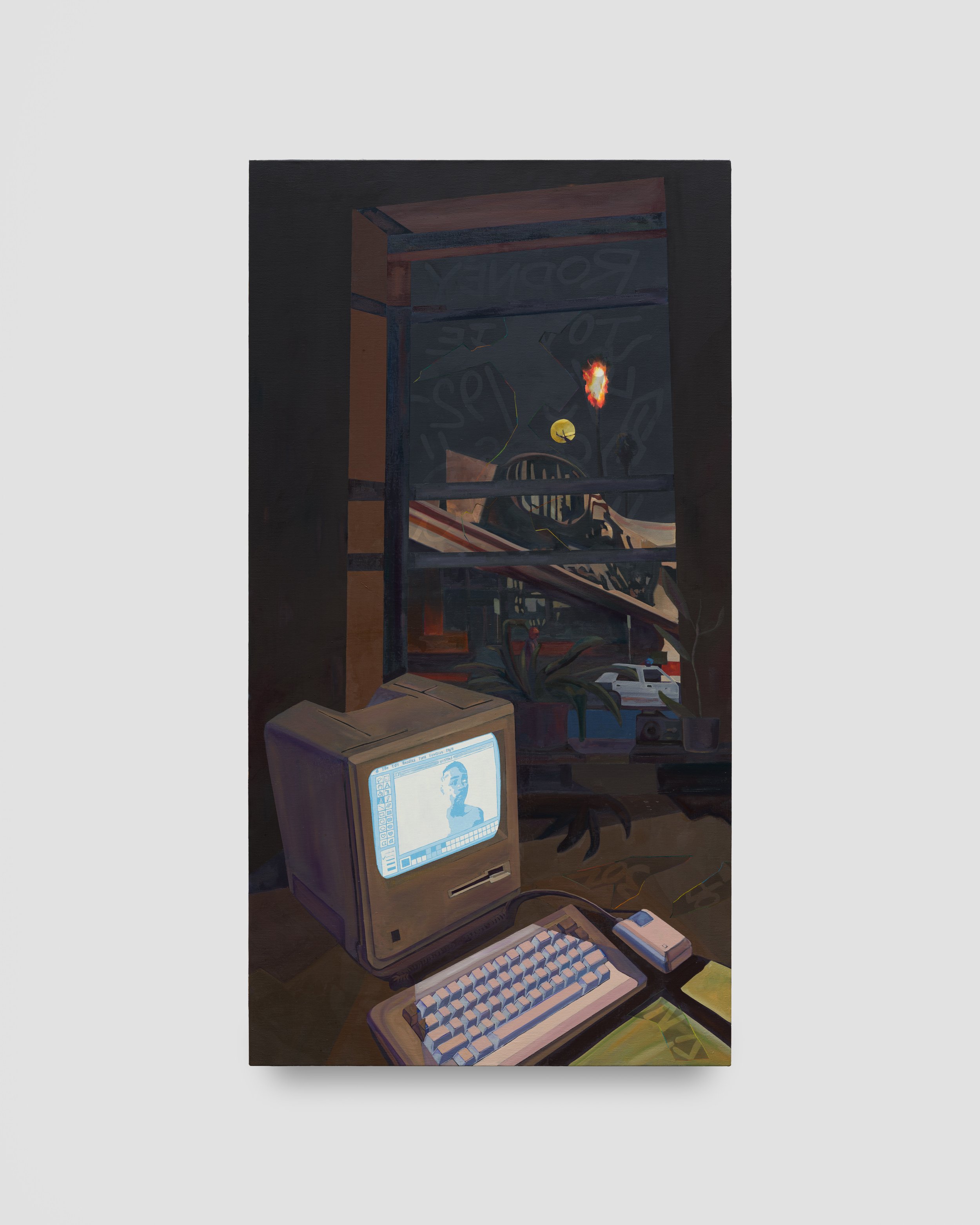 The exhibition’s cast of characters is largely made up of the artist’s family and friends. His brother joins the looters in Our Come Up, and Updates and Relief finds the artist’s mother studying a newspaper spread across her kitchen table whose splashy headlines tell of chaos and crackdown amid the 1992 uprising. Guevara sources archival print stories to create the newspapers in his paintings, stitching and collaging them together to create an imagined paper that enters the canvas through a phototransfer process. He uses this same process to infuse figures with ghostly hints of past traumas: images of war and rioting that are carried in the body like tattoos on skin. And yet many of the paintings here emphasize the resilience of continuing daily life – children playing, the work of family and care continuing – amidst the unrest on the doorstep.