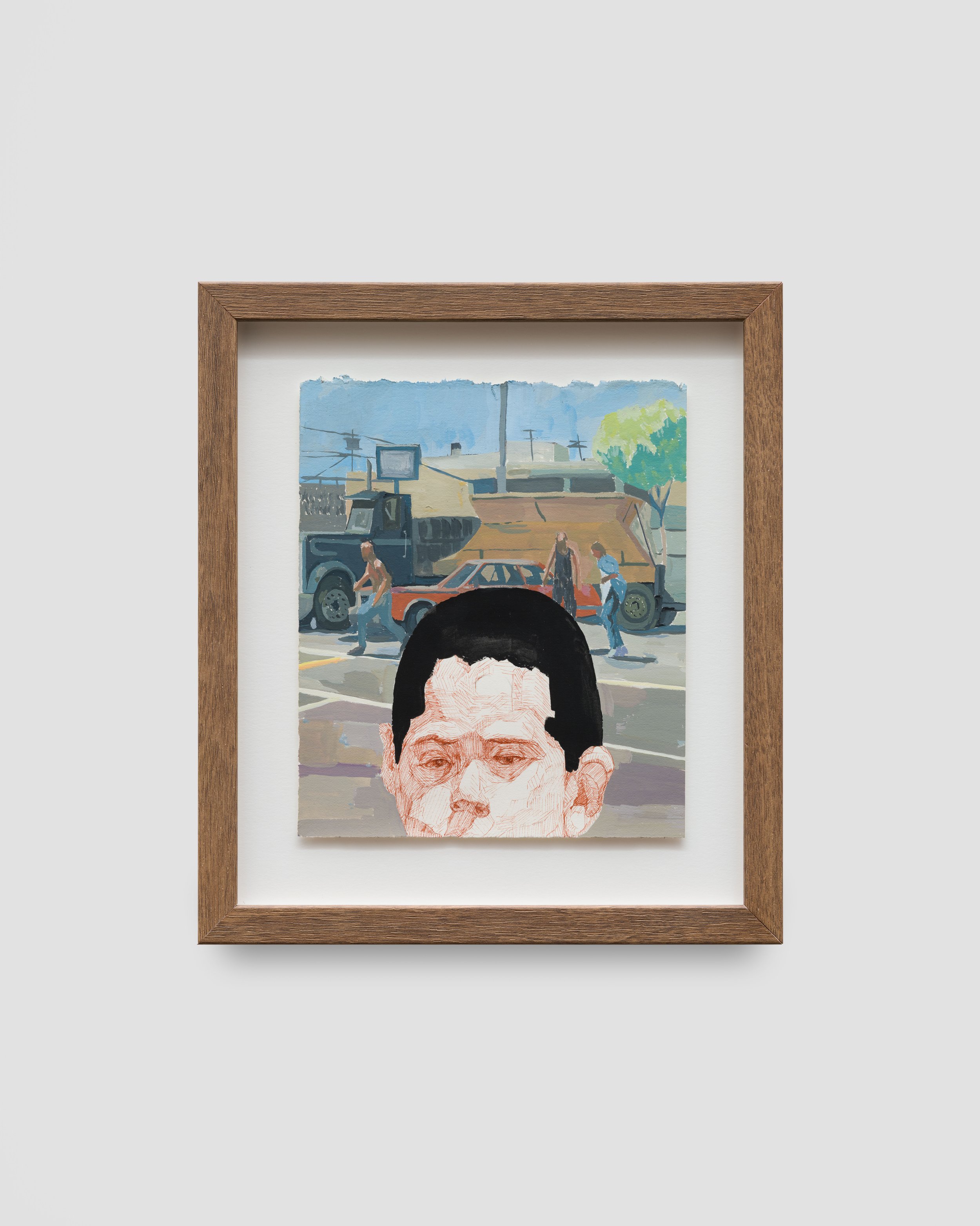 Guevara often riffs on art historical precedent, posing his contemporary figures as Renaissance nobles and saints. The large self-portrait Couple Hours after 3:15pm mirrors the figure of the 17th-century painting Portrait of a Man with a Sheet of Music from the Getty Museum collection. The classical setting has been swapped for a Los Angeles sidewalk, where the figure sits holding a newspaper announcing the beating of Rodney King. The scene appears placid at first, but the violent headline is echoed in the painting’s title – referencing the time at which the officers’ acquittal was announced – and the flames that erupt in the far distance. The contrast between the sunny California scene and the eminent violence glimpsed behind builds a tension that plays out across the exhibition.